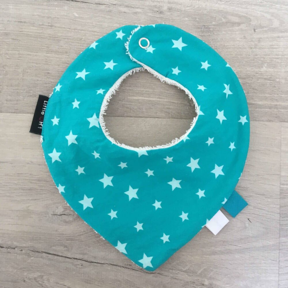 Bavoir bandana – avant en coton/jersey – arrière en tissu éponge – étiquettes décoratives – fermeture par pression.