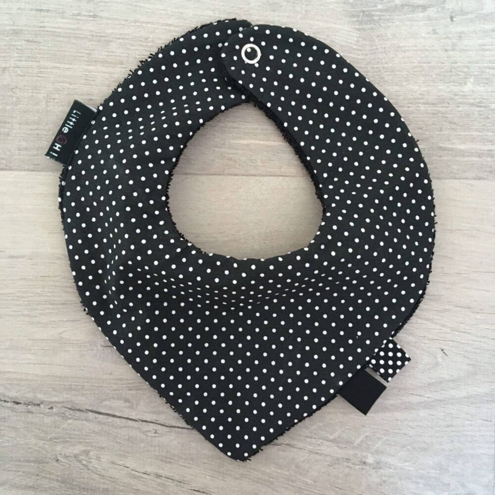 Bavoir bandana – avant en coton/jersey – arrière en tissu éponge – étiquettes décoratives – fermeture par pression.