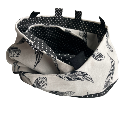 Snood à imprimé plumes en noir et blanc, avec côté extérieur en jersey et intérieur en coton.
